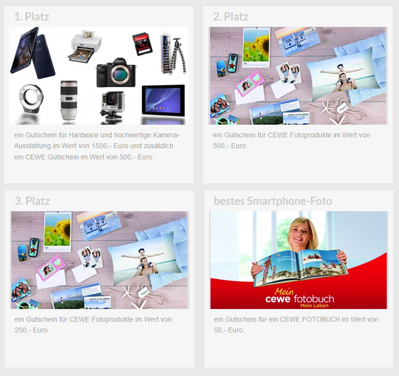 27.07.2015 - 30.11.2015 Feiern Sie mit: Vom 27. Juli bis zum 5. Oktober 2015 liegt jedem Fotoauftrag ein roter Luftballon mit unserem Jubiläumslogo bei. Nehmen Sie diesen CEWE Luftballon mit auf Tour und schicken Sie uns davon Ihre schönsten Fotos! Wir freuen uns auf viele kreative Einsendungen. Mitmachen lohnt sich: Mit Ihren besten Fotos haben Sie die Chance, einen von elf attraktiven Preisen zu gewinnen. Als Hauptgewinn lockt ein Gutschein für Hardware und hochwertige Kamera-Ausstattung im Wert von 1500,- Euro und zusätzlich ein CEWE Gutschein im Wert von 500,- Euro. Die Gewinner des 2. und 3. Platzes können sich über einen 500 Euro bzw. 250 Euro Gutschein für ein CEWE Fotoprodukt freuen. Für das beste Smartphone-Foto vergeben wir einen Gutschein im wert von 50 Euro. Wir wünschen viel Erfolg! Sylke Re: Wettbewerb: Wenn Fotos fliegen lernenLiebe Forenteilnehmer,