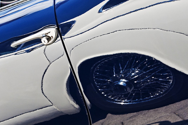 Re: Challenge 02/2016 – Es ist nicht alles Gold, das glänztDie Felge eines alten Jaguars spiegelt sich in der Karosserie eines anderen Oldtimers.