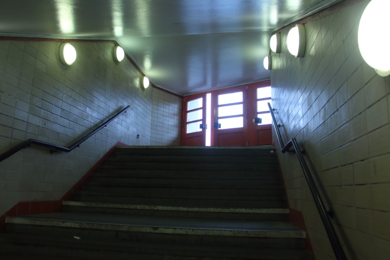Da bin ich ja froh, dass ich bei dem Schiff das Flutventil geöffnet habe, um freien Blick auf die Elbe zu bekommen Ich habe hier noch einen Durchblick der etwas anderen Art: Den Treppenaufgang des S-Bahnhofs Nordbahnhof in Berlin. Dort, wo man durch die roten Türen den Durchblick auf das strahlende Sommerwetter hat, stand bis vor 28 Jahren 28 Jahre lang eine Mauer. Der Bahnhof lag genau auf der Grenze von Ost-Berlin, hinter der Tür begann West-Berlin. Der Bahnhof war ein sogenannter Geisterbahnhof, der von der S-Bahn ohne Halt durchfahren werden musste - ein prägendes Erlebnis meiner Kindheit, weil ich bei Berlin-Besuchen fast täglich durch diesen Bahnhof fuhr, auf dem Weg zu meiner Unterkunft, die eine Station weiter, dann schon West-Berlin, lag.