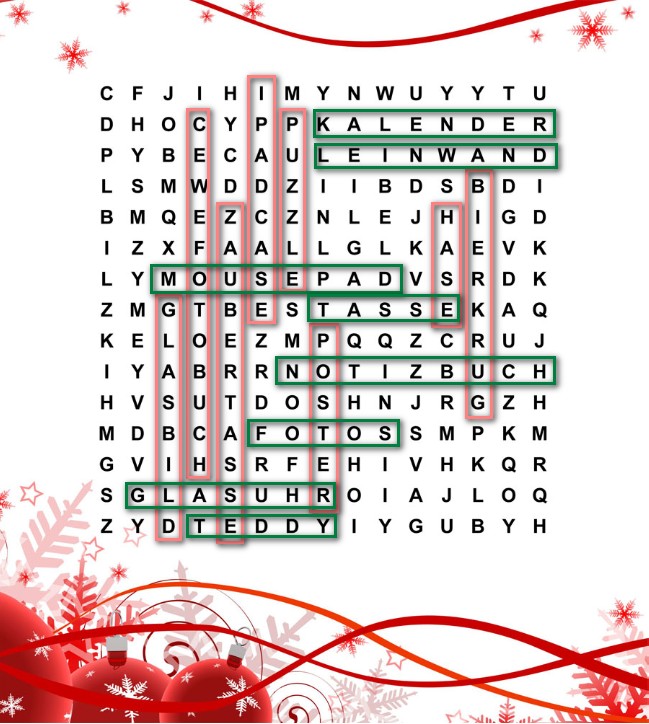 Ich habe folgende 18 Begriffe gefunden: 1. Leinwand 2. Kalender 3. Mousepad 4. Tasse 5. Buch 6. Fotos 7. Glasuhr 8. Teddy 9. Notizbuch 10. Glasbild 11. CEWE Fotobuch 12. Zaubertasse 13. iPadCase 14. Puzzle 15. Poster 16. Hase 17. Bierkrug 18. Job Re: Rätsel: Advent, Advent das dritte Lichtlein brennt1. Job