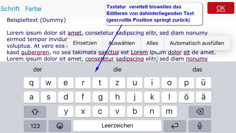 Die Eingeblendete Tastatur schiebt sich immer wieder sehr dominant vor den zu editierenden Text und vereitelt nach dem Scrollen sehr häufig, dass die gewünschte Textposition sichtbar und bearbeitbar bleibt.