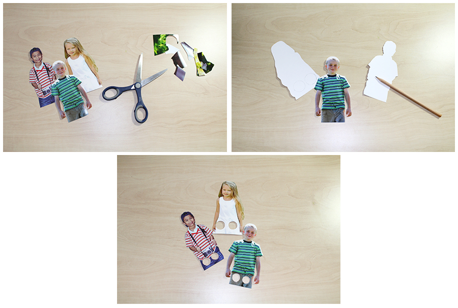 Tipp: Besonders gut eignen sich Fotos, auf denen ein Teil der Beinbekleidung sichtbar ist.3. Schritt: Fotos zuschneiden und Öffnungen für die Finger ausschneiden Nun schneiden Sie mit einer Schere die Silhouette jedes Kindes aus. Danach werden am unteren Rand des Bildes die Öffnungen für die Finger zunächst mit einem Bleistift vorgezeichnet und dann ausgeschnitten. Tipp: Achten Sie darauf, dass der Steg zwischen beiden Löchern und zwischen Löcher und Rand nicht zu dünn wird. Sonst besteht die Gefahr, dass dieser beim Spielen reißt. Alternative: Anstelle der von Kinderfotos, können Sie auch Bilder von Tiere nutzen. So können die kleinen Gäste Ihre Lieblingstiere untereinander tauschen und Tierlaute üben.Nun sind Ihre selbstgemachten Papierpuppen fertig und können in den Geburtstagstüten verstaut werden!