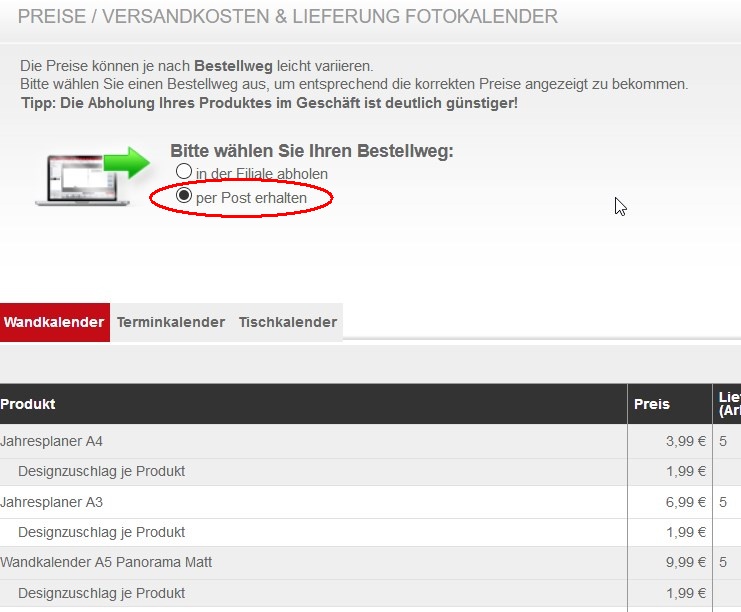 bei welchem Handelspartner wolltest du denn bestellen? Bei einigen kann man sich jedes Produkt nur zuschicken lassen, weil sie kein Ladengeschäft haben. Einen Wandkalender DIN A5 kann ich problemlos im Laden (z.B. in der Drogerie Budni) abholen. Re: Kalender kann nicht abgeholt werden?Hallo Karsta,