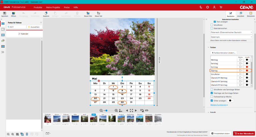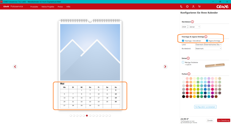 Der Tipp über den Kalender Konfigurator die Feiertagsdefinitionen einzuschalten war erfolgreich, dadurch war es möglich meinen Fotokalender 2024 wieder nach meinen Wünschen zu erstellen. Das war wirklich eine perfekte Hilfe! Vielen Dank! Viele Grüße Kalendary