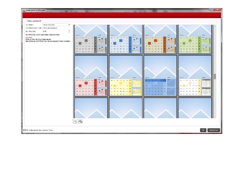Re: Farbwahl beim KalendariumIch bin eben auch bei meinem 5. (frei gestaltbaren) Kalender. Die Farbauswahl finde ich persönlich sehr unübersichtlich. Man Scrollt durch unendliche Vorschläge - eigentlich müsste doch auch das eigentliche Kalendarium und dazu noch eine Farbauswahl reichen, die man anclickt und sich das Kalendarium ect. entsprechend der Farbwahl verändert. Dann "übernehmen" und fertig.