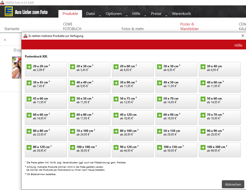 Ja super, es hat funktioniert, auch Edeka führt alle Formate!auch Edeka bietet diese Formate an. Bitte starten Sie einmal die Software und führen Sie eine Aktualisierung der Preisliste durch. Den entsprechenden Menüpunkt finden Sie unter "Preise". Danach sollten alle Formate ersichtlich sein. Vielen Dank Sylke! LG Zaubermaus LG Zaubermaus