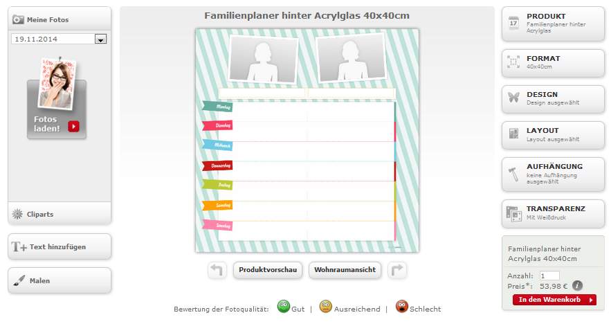 Der eine will zum Sport, der andere hat einen Arzttermin und irgendwann sollen alle noch gemeinsam am Tisch sitzen und essen! Eine Familie zu managen kann manchmal ganz schön anstrengend sein. Man kann schnell den Überblick verlieren und schon läuft man von a nach b und wieder zurück. Dafür gibt es jetzt jedoch eine Stresslösung: unseren Familienplaner. Den Familienplaner können Sie online bei Ihrem Handelspartner bestellen. Klicken Sie sich dafür in den Bereich Poster & Fotoleinwand. Dort finden Sie unterschiedlichste Design- und Layoutvorschläge mit denen Sie Ihren Familienplaner Ihren Bedürfnissen anpassen können. Dabei können Sie frei wählen ob Sie beispielsweise ein Familienfoto oder mehrere Einzelbilder wählen möchten. Bei der Aufhängung haben Sie die gleiche Auswahl wie auch bei unseren Acrylglaswandbildern. Sollten Sie keine eigene Lösung haben, können Sie den Planer mit dem Schraubsystem an die Wand hängen, welches Sie unter dem Punkt „Aufhängung“ auswählen können. Mit Namen und Bildern Ihrer Liebsten können Sie nun die Woche bewusst planen und wichtige Termine im Blick behalten. Ebenso haben die Vergesslichen unter Ihnen eine Gedächtnishilfe, die Sie entspannter durch den Tag gehen lässt. Sie möchten gerne sehen, wie leicht der Familienplaner hinter Acryglas sich beschriften lässt? Dann werfen Sie doch mal ein Blick in das nachfolgende Video Mit dem Blick auf Weihnachten wäre dies vielleicht das passende Geschenk für Ihren heimlichen Familienmanager daheim? Falls wir Ihr Interesse geweckt haben, werfen Sie doch einfach mal online einen Blick auf unseren Familienplaner hinter Acrylglas. Vielleicht ist dieses Produkt genau das richtige für den noch leeren Platz unter Ihrem Weihnachtsbaum ;-) Liebe Grüße
