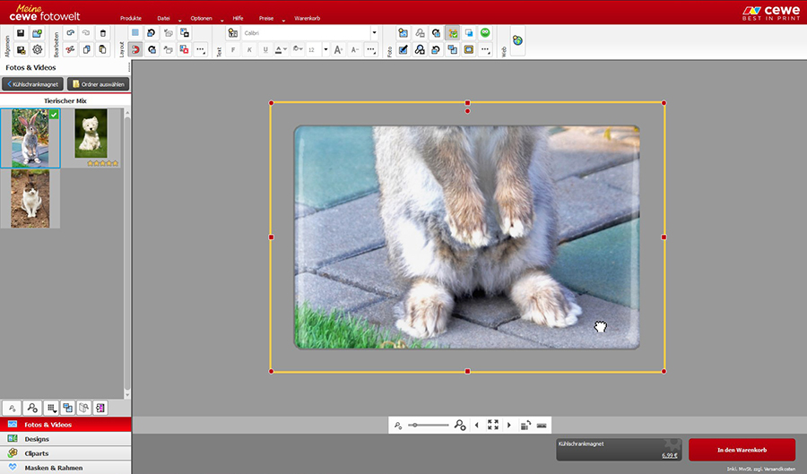 Tipp: Natürlich können Sie anstelle von Tieren auch andere Motive nutzen. Verschiedene Obstsorten, Automodelle oder Lieblingscomicfiguren wären einige weitere Ideen. Dabei sollten Sie bedenken, dass mit der Anzahl der Motive die Kombinationsmöglichkeiten und der Spaß am Mixen stetig anwachsen.Und so gehen Sie vor: Schritt 1: Auswahl der Motive Zunächst suchen Sie für die Kühlschrankmagnete geeignete Motive aus. Dabei sollten Sie darauf achten, dass die Objekte einen ähnlich großen Anteil der Aufnahme einnehmen. Sobald Sie passende Aufnahmen ausgesucht haben, ziehen Sie das erste Foto in das Bildfeld des Kühlschrankmagnets. Dann „greifen“ Sie die erste Aufnahme mit gedrückter Maustaste und richten diese im Bildfeld aus. Wir haben uns im Vorfeld überlegt, dass unserer tierischer Mix aus immer zwei zusammenpassenden Teilen bestehen soll. Dementsprechend haben wir das Bild so ausgerichtet, dass auf dem ersten Magneten der obere Teil des Motives zu sehen ist. Nachdem Sie den ersten Teil ausgerichtet haben, klicken Sie auf die Schaltfläche „In den Warenkorb“ und speichern Ihr Projekt ab. Danach befinden Sie sich im Warenkorb und können Ihre bisher abgelegten Produkte sehen. Unter Ihrem soeben erstellten Magneten befindet sich das Feld „Kopie bearbeiten“. Das wählen Sie an. Tipp: Machen Sie von jedem Magnet einen Screenshot (in den meisten Fällen ist es die Druck-Taste Ihrer Tastatur) und speichern Sie diese ab. Dann können Sie diese beispielsweise auf eine leere CEWE FOTOBUCH Seite ziehen und ausprobieren, ob alle Teile tatsächlich zusammenpassen.Zusätzlich haben wir für Sie eine kurze Schritt-für-Schritt-Anleitung in Form eines Videos erstellt: Wie finden Sie unsere Gestaltungsidee? Konnten wir Sie dazu inspirieren unser kleines, tierisches Kühlschrankmagnetspiel nachzubauen? Oder sind zumindest die ein paar Kindheitserinnerungen an das ein oder andere Spiel geweckt worden? Zuletzt als neu markiert von Irina am 23.06.2016, 12:53. Lieben Gruß