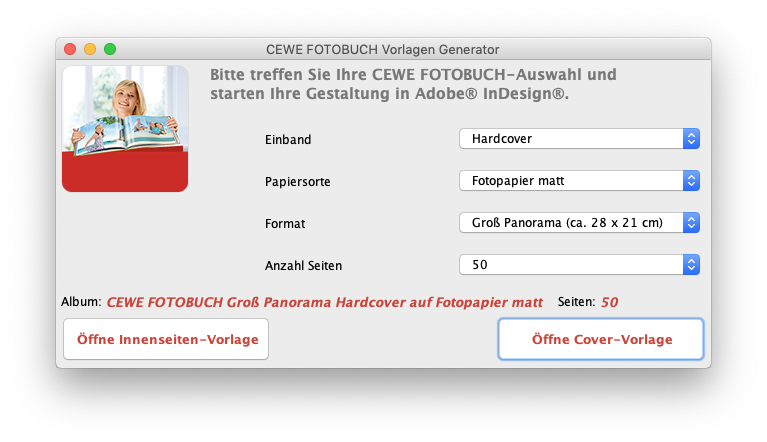 leider setzt der 'CEWE Fotobuch Vorlagen Generator' eine installierte InDesign Version voraus. Obwohl Affinity Publisher seit Version 1.8 nun auch den Import von Indesign *.IDML Vorlagen unterstützt. Toll an dem Vorlagen-Generator ist, dass man neben dem Format auch die Anzahl der Seiten konfigurieren kann und abhängig davon wird bei der Vorlage der Buchrücken dicker/schmaler konfiguriert! Unschön ist, leider dass der Vorlagen-Generator nicht einfach eine IDML-Datei speichert, die man dann per Doppelklick in Affinity öffnen kann. Stattdessen will der Generator die konfigurierte Vorlage direkt mit InDesign öffnen. Was den InDesign Besitzern nur einen Doppelklick spart ist daher für Affinity-User ein Showstopper. Für Mac-User mit Affinity-Designer 1.8 funktionieren folgende Schritte zum Generieren und Öffnen einer IDML-Datei für ein CEWE Fotobuch: (Aber Achtung: Ich übernehme keine Garantie für eventuelle Fehldrucke oder Crashes oder anschließende Probleme mit Affinity Publisher!)