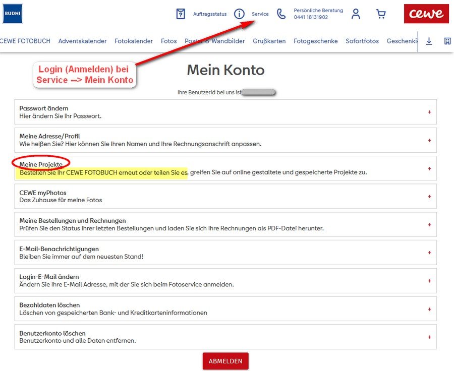 Auf der Webseite des Handelspartners, über den man das Fotobuch oder ein anderes Fotoprodukt bestellt hat, gibt es meist unter "Service" eine Anmeldemöglichkeit: