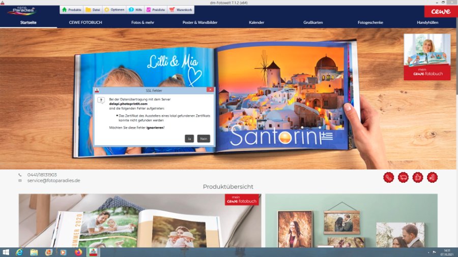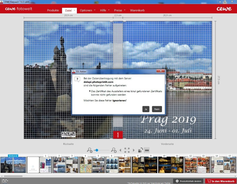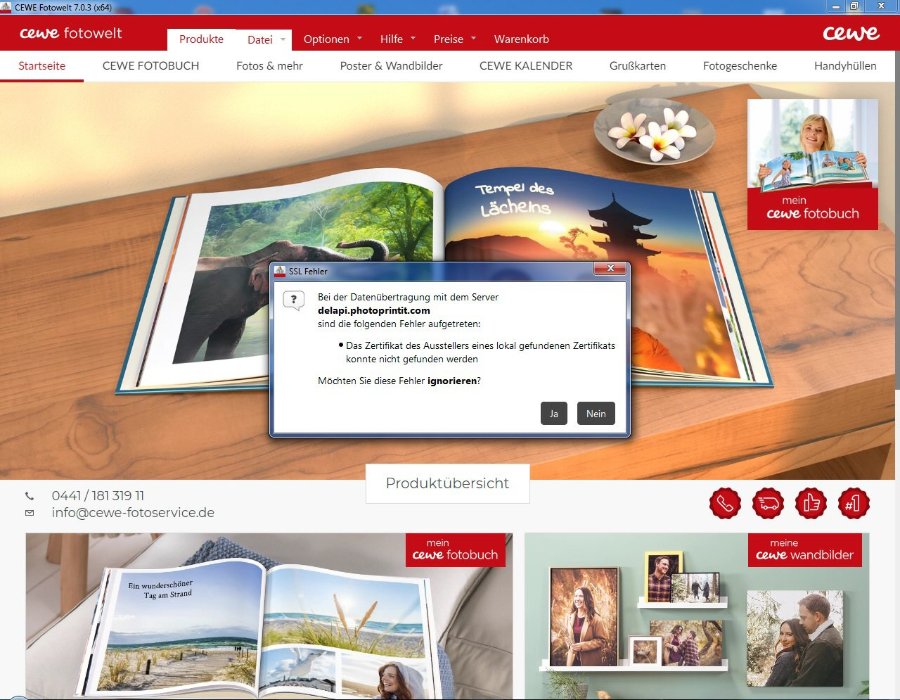 Fehlermeldungen beim Laden der Software und des Fotobuchesich nutze die Version 7.0.3 von CEWE Fotowelt und "bastle" seit Monaten immer mal wieder an meinem Fotobuch. Als ich es gestern nach 3 Wochen mal wieder öffnete, bekam ich diverse Fehlermeldungen, sowohl beim Laden der Software als auch beim Laden des Fotobuches. Beim Laden der Software kam u.a. (ich zitiere, da ich nicht weiß, ob das Anhängen der Bilder klappt): "Bei der Datenübertragung mit dem Server delapi.photoprinitit.com sind folgende Fehler aufgetreten: - das Zertifikat des Ausstellers eines lokal gefundenen Zertifikats konnte nicht gefunden werden Möchten Sie diese Fehler ignorieren" Ich habe jetzt einmal "ja" angeklickt und einmal "nein" - es machte scheinbar keinen Unterschied. Es kamen auch noch andere Fehlermeldungen, die ich nicht notiert habe. Beim Laden des Buches kam die oben genannte Meldung noch einmal und u.a. "Fehlende Komponenten gefunden Es fehlen Cliparts, Hintergründe, Masken, Rahmen oder Designs. Möchten Sie diese automatisch nachladen?" Wenn ich sie nachladen möchte, bekomme ich die Meldung, dass es keine Verbindung zum Server gibt (was aber an meinem Server nicht liegen kann, der funktioniert). Dieses Problem ist noch nie aufgetreten. Woran kann das Liegen, dass keine Verbindung zu ihrem Server aufgebaut werden kann? Ich hoffe, jemand weiß Antwort, vor allem weil es dann ja wohl auch bedeuten würde, dass ich das Buch gar nicht bestellen kann. Vielen Dank schon mal im Voraus