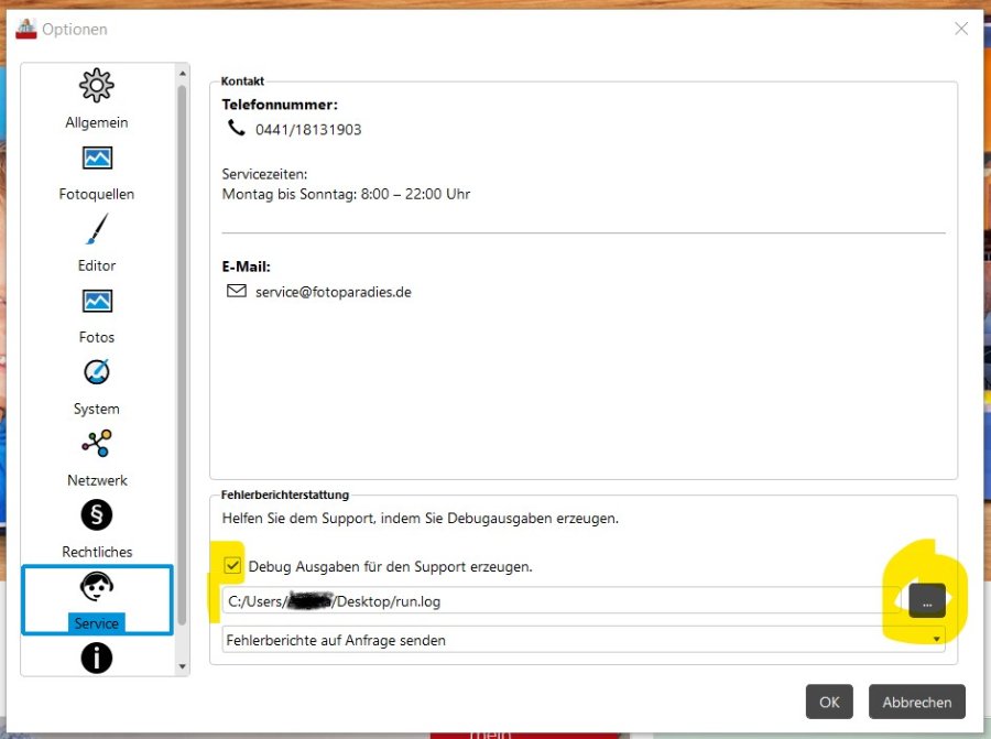 Re: Fehlermeldungen beim Laden der Software und des FotobuchesDie run.log-Datei wird nicht automatisch erzeugt. Schau mal, ob bei Dir unter Optionen --> Einstellungen -- Service das markierte Häkchen gesetzt ist. Dort siehst Du auch, wohin die Datei gespeichert wird und kannst den Speicherort ggf. anpassen.