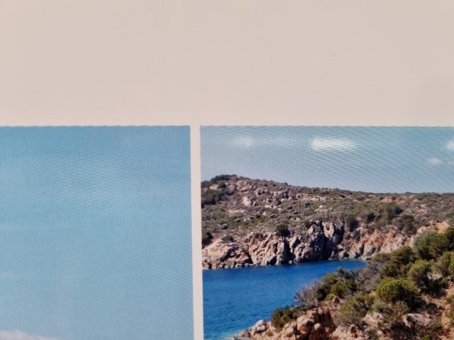 Das lässt sich im Digitaldruck leider nicht ganz verhindern. Damit das Raster beim Betrachten nicht ins Auge fällt, wird das Raster in einem bestimmten Winkel ausgerichtet, da das menschliche Auge besonders sensibel auf horizontale und vertikale Linien reagiert.