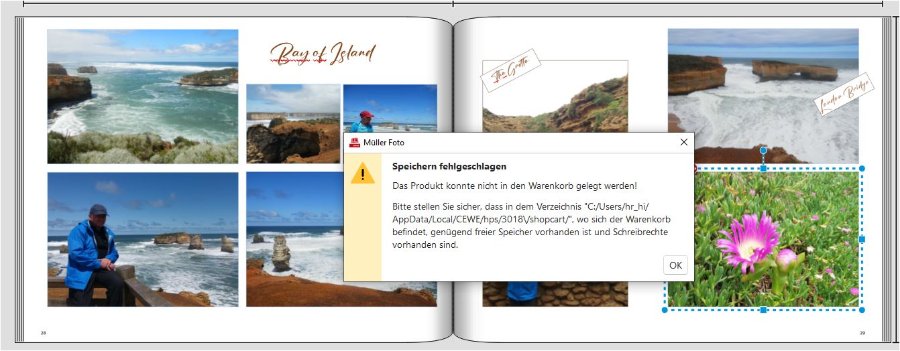 ich arbeite mit der neuen Version 7.3.3. Windows anbei die Meldung, dass der Warenkorb nicht abgespeichert werden kann. Außerdem kam schon zuvor die Meldung, dass Platzhalter nicht befüllt sind. Dies habe ich kontrolliert, aber nichts gefunden. Ich weiß, dass es von selber Meldung darüber schon einige Threads gibt. Hab auch hier schon versucht eine Lösung zu finden. Außerdem habe ich das Fotobuch unter einem anderen Verzeichnis abgespeichert. Auch dies hat nichts gebracht und bei den Daten der Fotowelt werden 0 KB angegeben, während bei der Originaldatei 1.34 GB angegeben sind. Ich hatte das Objekt im Urlaub über das Tablet erstellt und die Datei dann hochgeladen und am PC weiter bearbeitet. Ich weiß jetzt wirklich nicht mehr weiter. Speicherplatz ist genügend vorhanden. Ich hoffe auf schnelle Hilfe oder einen Rückruf von einem CEWE Techniker. Vielen Dank! Liebe Grüße Asiafan