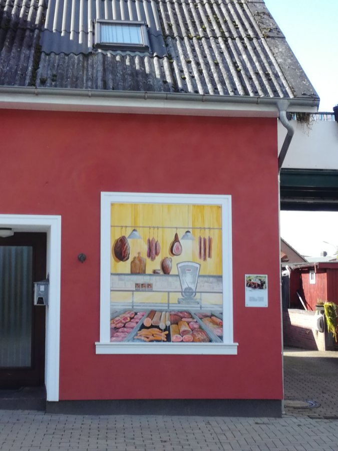 und habe dieses schöne Bild gefunden. Nach der Verschönerung der Fassade wurde das Bild gemalt und rechts ist eine kleine Tafel auf der die Namen und Zeiten der jeweiligen Schlachter steht. Liebe Grüße Elchfreund