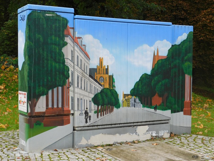Frauke Re: Foto-Aufgabe Oktober: Kunst im VorbeigehenUnd jetzt nochmal ein Foto, welches ich heute extra für die Challenge aufgenommen habe: mit Graffiti verschönerte Trafohäuschen gibt es in der gesamten Stadt (bevor die Schmierfinken kommen) dieses steht gegenüber dem Bahnhof und zeigt die Stargarder Straße (um 1900?)