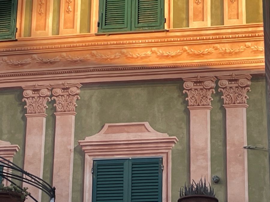 Frauke Re: Foto-Aufgabe Oktober: Kunst im VorbeigehenEin schönes Beispiel für Fassadenmalerei habe ich aus Levanto mitgebracht: Eine prächtige Barockfassade mit vorgesetzten Säulen und Simsen, sieht täuschend plastisch aus, ist aber alles, bis auf die Fenster, gemalt.