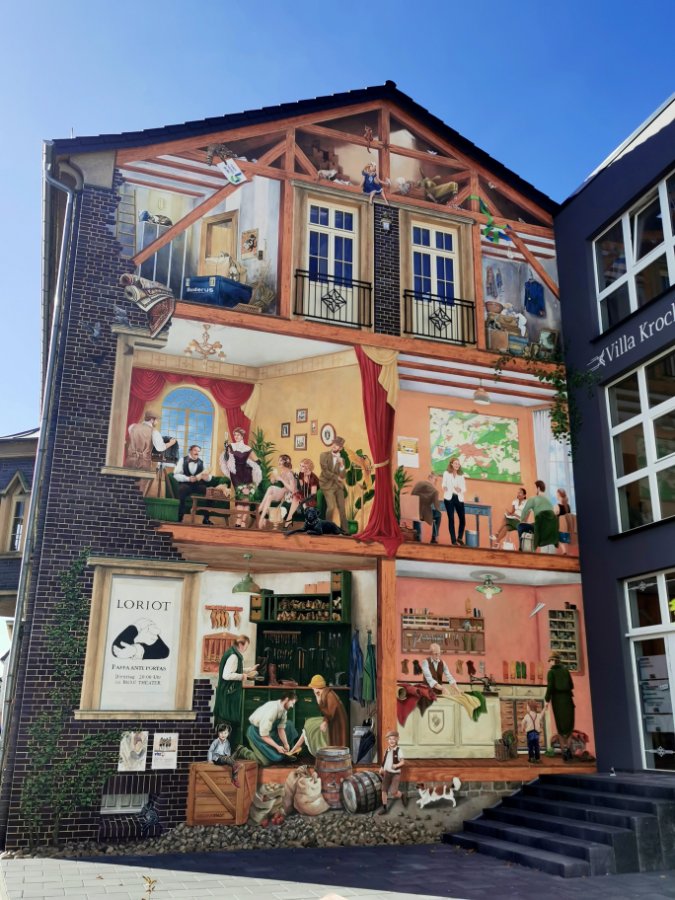 Re: Foto-Aufgabe Oktober: Kunst im VorbeigehenDiese große Faassadenmalerei ist in meiner Heimatstadt Burg bei Magdeburg an der ehemaligen Villa des Lederhandschuhmachers Wilhelm Krocker. Zu DDR-Zeiten und bis zum Verkauf an einen privaten Investor war das Gebäude die Volkshochschule. Man findet hier Hinweise zur Geschichte des Hauses und der Stadt.