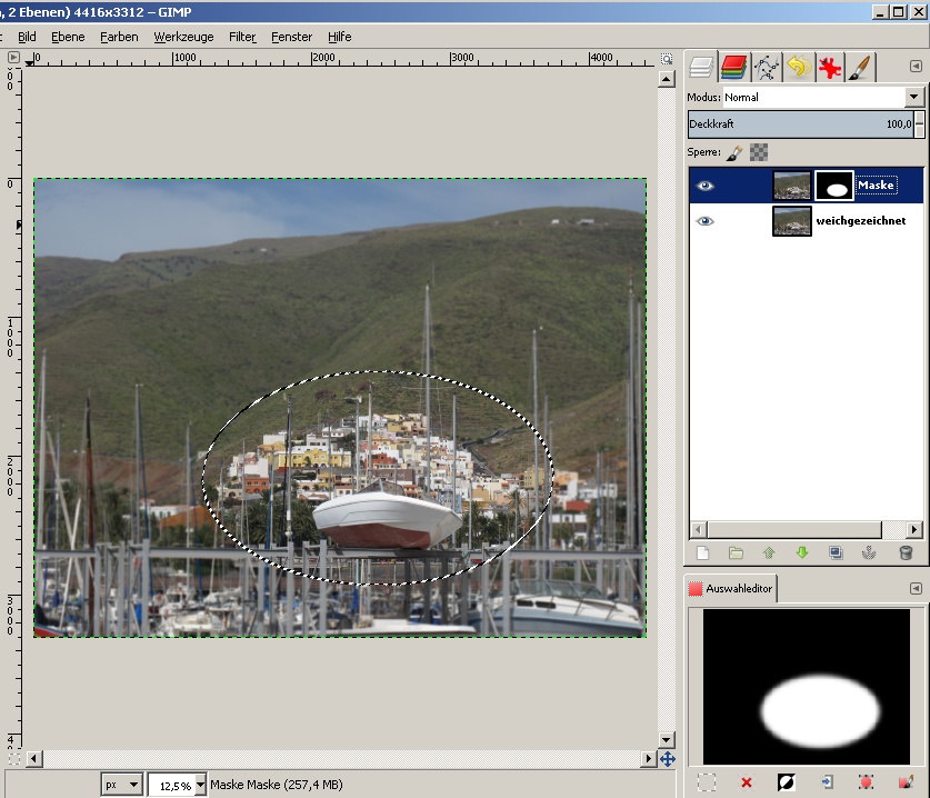 Das geht dort nicht ganz so komfortabel wie in Photoshop, aber aufwändig ist es auch nicht Ich habe das Original dupliziert, das Original weichgezeichnet und der Kopie eine (schwarze) Maske zugefügt. Dann habe ich eine elliptische Auswahl erstellt, diese mit einem großen Radius ausgeblendet und die Maske innerhalb der Auswahl mit weiß gefüllt. Die Maske kann man dann selektiv noch etwas nacharbeiten und das Ergebnis funktioniert liebe Grüße