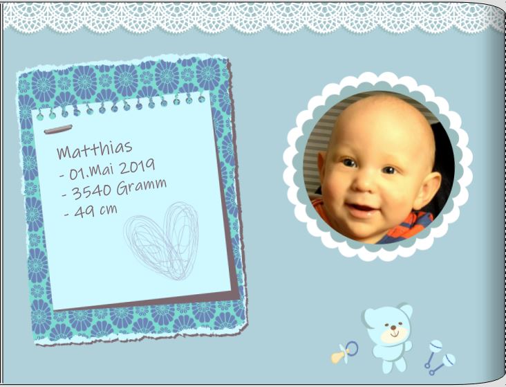 Für dieses Baby CEWE FOTOBUCH habe ich ein Scrapbook Design erstellt.