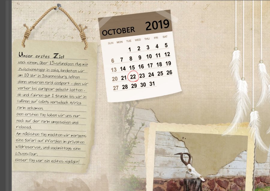 Re: Umfrage zur TextgestaltungCSSky hat geschrieben: Hast Du eventuell ein paar Ideen, welche Schrift gut lesbar ist und trotzdem nach Handschrift aussieht. Im Moment habe ich "Dessau" dafür genommen. Du hast zwar Reisetante gefragt, aber ich habe in meinen Südafrika Büchern auch Notiz-Zettel mit Handschrift benutzt, und habe dafür Cheyenne Hand genutzt. Ich finde die Schrift passt ganz gut als Handschrift, vielleicht gefällt sie dir ja auch... Liebe Grüße,