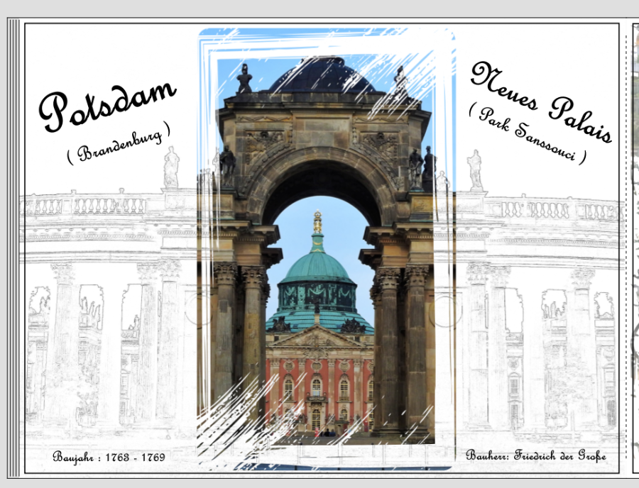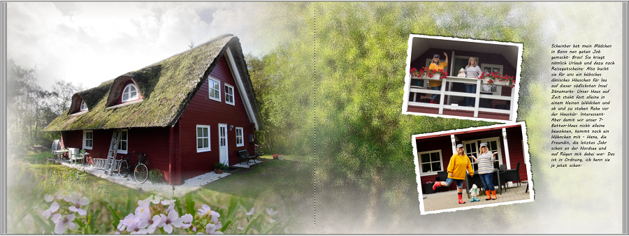 Fotos mit Verlauf (oben und unten)- zwischen den Fotos habe ich farbige Bilder aus meiner Sammlung gesetzt (die ich nach Bedarf umfärbe)- einen schmalen Farbrahmen um Fotos- und einen farbigen Hintergrund. Ist zwar ein eher unspektakuläres Design, aber ich finde das es ganz interessant aussieht. Es zeigt, das man auch recht unkompliziert, sehr schöne Effekte in der Software erzielen kann. L.G.