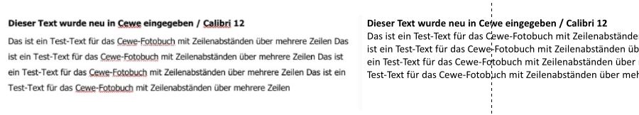 Das ist eine mögliche Erklärung für die Unterschiede. Ich habe das getestet mit: CEWE 6.3.3 Office 365 (= Office 2016) Ich habe cewe 6.3.1, windows10, word2007. Trotzdem ist bei Deinem letzten Beispiel etwas nicht stimmig. So große Zeilenabstände entstehen bei cewe nicht. Hast Du vielleicht versehentlich doch per copy and paste Text eingegeben, statt ihn in cewe zu setzen? Oder Du hast den Text im vorherigen Textblock mit den aktuellen Formatierungen geschrieben, dann wird die vorhergehende Formatierung automatisch von cewe übernommen. Das ist jedenfalls meine bisherige Erkenntnis mit den o.a. Softwareeinstellungen. Siehe den Unterschied: