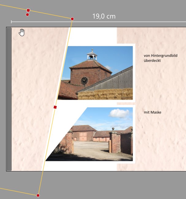 Re: Bilder auf nur einer Seite schrägIch glaube, die Fotos haben weiße Rahmen und wurden ganz normal platziert - und dann mit einem schräg gestellten weißen Clipart teilweise überdeckt. Bei einem einfarbig weißen Hintergrund ist das prima zu lösen.