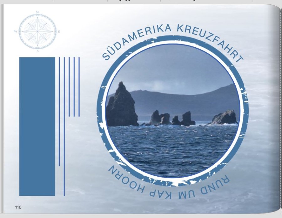 Ja, irgendwie schon komisch, den Titel hatte ich von Anfang an so und mir keine Gedanken mehr gemacht.Für Kap Hoorn würde ich separate Seiten und eine entsprechende Überschrift/Text anlegen. LG Andrea Ich werde die Überschrift am Cover noch mal überarbeiten. Was haltet ihr von "Kreuzfahrt Südamerika"? Wobei es ja auch wieder nur 4 Länder betrifft und nur 4 Wochen Kreuzfahrt. Evtl. probiere ich um den Kreis diese 4 Länder in TextArt zu schreiben. Mal sehen ob es mir gelingt. @Andie, natürlich habe ich im Fotobuch etliche Doppelseiten für das Kap Hoorn gestaltet. Liebe Grüße Asiafan