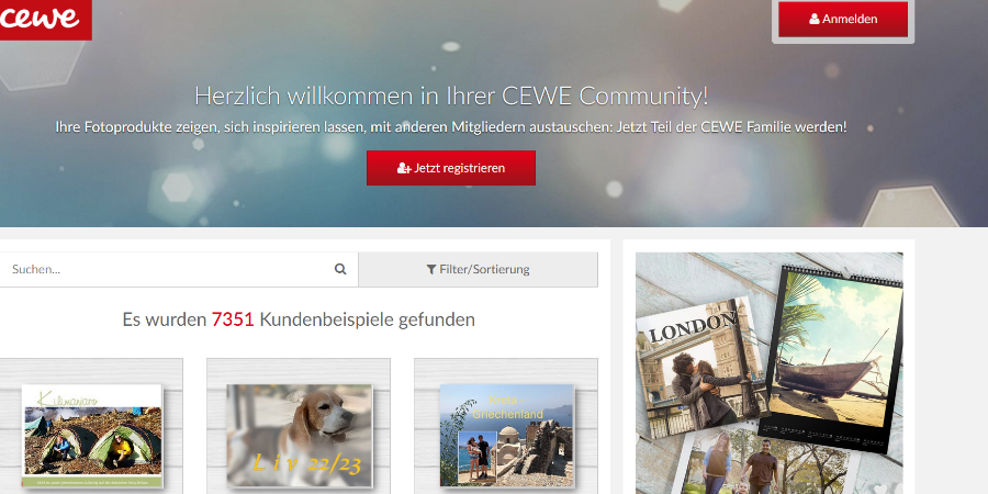 über die Kundenbeispiele in der CEWE Gestaltungssoftware kommst du über die Verlinkung auf die Webseite mit ausgewählten Kundenbeispielen: https://www.cewe.de/cewe-fotobuch/kunde ... l?hps=true Entscheidet man sich dann für ein Thema z.B. "USA" kann man noch weitere Kundenbeispiele anwählen, und kommt zu den über 7.000 Kundenbeispielen für die Community: https://www.cewe-community.com/global/? ... egory_id=1 Liebe Grüße [Sebastian} Re: FotobuchsucheHallo Traumtänzer, auf die Maske mit den Filtern, die Du mir als Screenshot geschickt hast, komme ich nicht,