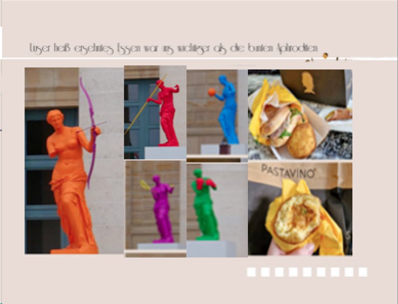 Hallo Nici,geht mir genauso. Die interessanten Skulpturen haben Aufmerksamkeit verdient. Die Fastfood-Bilder dominieren hier aber. Da du auf die Essensbilder nicht verzichten möchtest, sollten sie zumindest gebührenden Abstand halten. Re: Fotobuch ParisHallo, Nici!