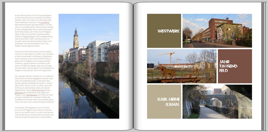 Blumen bringt er auch! Ich war schon ganz beeindruckt, dass er eure Puzzles löst! Auf deinem Avatar-Bild schaut es so aus, als würde er hinzeigen, wo du den Puzzle-Stein, den du - wie man es auf dem Bildausschnitt nicht sieht, ich es mir aber vorstelle - in der Hand hältst, einsetzen musst. Jetzt möchte ich noch ein paar Anmerkungen zum Graffiti-Buch anbringen. Die allerletzte Variante von Seite2+3 finde ich sehr gelungen. Ob mir die linke Spalte in Blocksatz oder Flattersatz besser gefällt, kann ich gar nicht sagen. Ich habe lange Zeit nur Blocksatz verwendet und freunde mich jetzt immer mehr mit Flattersatz an, weil er auf mich irgendwie lebendiger wirkt. Die Platzierung der Schrift auf der rechten Seite gefällt mir so besser. Ich würde aber auch noch das Westwerk auf zwei Zeilen und der Karl-Heine-Park auf 3 Zeilen aufteilen. Bei deinem Beitrag mit deinen Lieblingsmotiven schaut es am zweiten Bild so aus als wäre die Farbe von der Farbfläche im linken unteren Eck auch um den äußeren Rand der Bildfläche herumgezogen worden; im ersten Bild dieses Beitrags scheint aber nichts um das Bild, das aus der Farbfläche herausschaut, herumgezogen zu sein; oder sieht man das am Screenshot nur nicht? Ich sehe es auch so wie Bäuerin, dass das Rahmenkonzept auf S.2+3 dem Rahmenkonzept auf den anderen Seiten entsprechen sollte. D.h. dann müsste die jeweilige Farbfläche als Rahmen über das zugehörige Bild gezogen werden. Wohlgemerkt - das fällt mir auf, wenn ich beliebig lange auf einer handvoll deiner Seiten nach Kritikpunkten suche. Wenn ich das Buch in der Hand hätte, würde ich es nur Seite um Seite genießen und mir fiele nix zu verbessern ein. Viel Spaß noch beim FInalisieren! Re: Font für Graffiti-Buch gesuchtgrasmuecke hat geschrieben: Jetzt möchte ich noch ein paar Anmerkungen zum Graffiti-Buch anbringen.... Auf die Idee, "Westwerk" einfach auch zweizeilig zu gestalten, bin ich noch gar nicht gekommen. Ich finde das "Krümelsuchen" von Euch sehr gut, deshalb frage ich ja auch nach. Während man selbst gestaltet, wird man oft betriebsblind. Also ich zumindest. Deshalb DANKE für alle Ideen und Anmerkungen! Zum Kater: Das sind zwei. Liebe Grüße