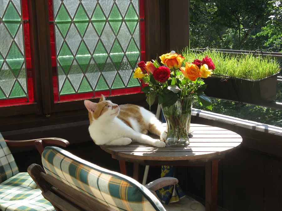 Tigers Blick geht eher an den Blumen vorbei gen Dach, wo sich Tauben, Spatzen und Co. tummeln. Ich könnte mich immer schlapp lachen, wenn Tiger die Vögel anmeckert und die Vögel ihn. Beim Meckern bleibt es zum Glück auch...Ein sehr hübscher. Ich habe mal wieder einen adoptierten Streuner. So lieb, aber noch nicht ganz gesund. Ich hoffe sehr, das kriegen wir noch hin. Deinem Streuner drücke ich feste die Daumen!! Behaltet Ihr ihn dann auch? Oder peppelt Ihr "nur" auf und gebt ihn dann wieder ab? Liebe Grüße