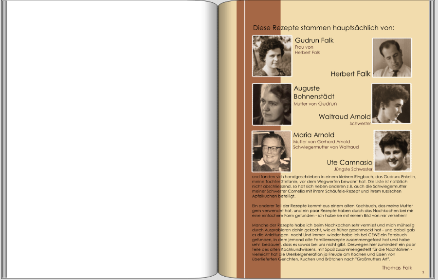 Liebe Silberdistel,Ich hoffe, dass du meine kleinliche Nörgelei nicht krumm nimmst. Es sind wirklich nur Kleinigkeiten. Einem Nicht-Fotobuch-Gestalter würde vermutlich überhaupt nichts auffallen. mit Bewunderung für Dein scharfes Auge habe ich die angesprochenen Punkte korrigiert, Du hattest natürlich recht. Das kommt auch daher, dass ich all dies (Schriftgröße, Abstände etc.) im Feinschliff erst ganz am Schluss nochmals prüfe, nach der abschließenden Rechtschreibprüfung - und beides macht meine Gattin dann auch nochmal. Und wir wissen, dass man trotzdem die letzten Fehler erst findet, wenn man das ausgedruckte Werk in Händen hält - deswegen ist das erst Exemplar immer für mich, verschenken an meine Schwestern und Enkel werde ich dann die nochmal korrigierte Form. Zum Thema Rezeptgeberin und Bild: Überlegt habe ich mir, dass überall da, wo dies meine Mutter ist, ein (immer wieder anderes) Bild von ihr verdeutlicht, dass es ein Rezept von ihr ist, schließlich heißt das Buch ja auch "Mamas Rezepte". Ich könnte natürlich einen Zusatz anbringen, beim Hirtentopf z.B. "Schweinebraten a la Mama", würde der Symetrie dienen, ist aber noch nicht endgültig entschieden. Und ich empfinde die ganzen Kommentare nie als Nörgelei, sondern als wirkliche Hilfe. Wie oben schon mal geschrieben habe ich ja noch nie mit externer Unterstützung ein Fotobuch gestaltet, ich finde es klasse, dass man sich so intensiv mit meinen Machwerken auseinandersetzt und wertvolle Tipps im Ergebnis dabei rauskommen!. Und da ich bei meiner Familienchronik noch ganz am Anfang bin, werde ich diese Hilfe dort vielleicht auch in Anspruch nehmen wollen - oder sogar müssen. LG