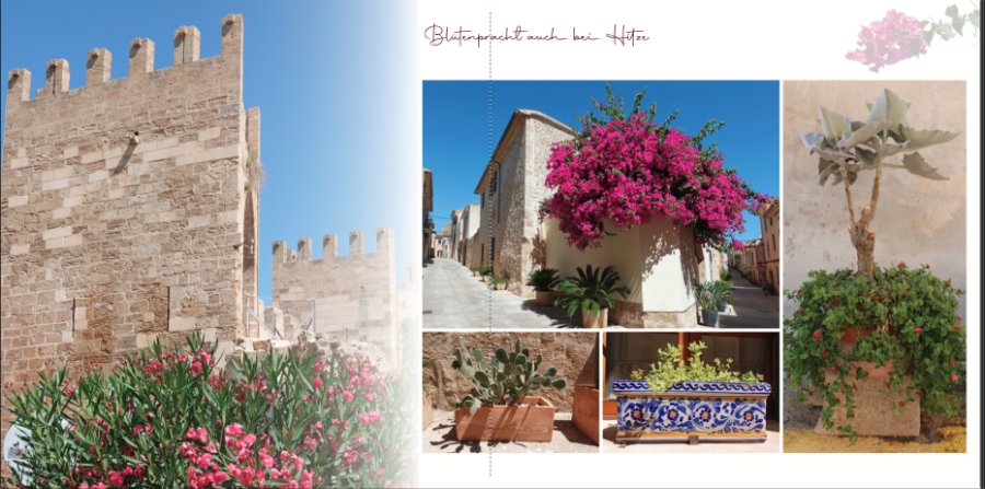 Das Buch wird lay-flat, von daher habe ich ja eigentlich keinen Falz, ein Teil der Fotos sind ja auch über der Buchmitte, also eher als 1/3-2/3-Aufteilung, ich bin aber prinzipiell damit noch nicht zufrieden, bloß fällt mir grad keine optimale Lösung ein. Da ich im Juli auf Mallorca war, halten sich meine Aufnahmen von blühenden Pflanzen auch ziemlich in Grenzen... Traumfänger hat geschrieben: Die Blütenpracht scheint mir aber zu Alcudia zu gehören, insofern finde ich dort eine anders gestaltete "Unterüberschrift" passend. Vielleicht gibt es ja in dem Buch noch mehrere Seiten, wo dieser Schrifttyp passt.