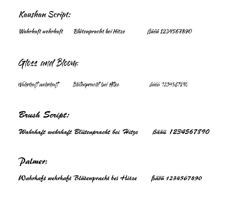 vielen Dank. "Indie Flower" gefällt mir nicht so gut und Bollivia Rosilla Script hat u.a. kein "ß" Schade... Aber ich habe dafür Bellarina entdeckt, die mir auch gut gefällt und nehme die statt Autography. Die Idee des "Wahrhaft wehrhaft" unten hinzuschreiben, finde ich gut, das probiere ich mal aus. Re: Mehrere Schriftarten im BuchHallo Reisetante,