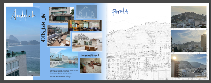 Falls Du noch etwas zupfen willst: Ich würde die Reisedaten auf der linken Seite des Inhaltsverzeichnisses in der Schrift schreiben, die Du in der Zeile darüber genutzt hast. Rat Infested Mailbox finde ich für Zahlen nichts so schön, weil auch nicht so gut lesbar. Copacabana-Strand-Seite rechts: Hast Du hier schon probiert, das kleine Hotelfoto so groß zu ziehen, dass die obere Kante eine Linie mit der oberen Kante von RIO bildet? Und dann den Hotelslogan über das Bild zu stempeln? 2. Copacabana-Seite: Hier würde ich keine verschiedenen Schriften für LUNCH Time etc. verwenden. Auch finde ich den Wechsel deutsch/englisch bei FUSSBALL Time komisch. Wie wäre es an dieser Stelle mit der Schrift, die Du hier auf der linken Seite für Copacabana (rosa) verwendet hast? Und dann halt Soccer Time oder Fußballzeit. Liebe Grüße