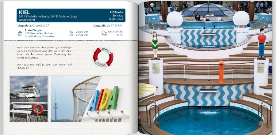 die Kapitelöffner-Seite gefällt mir sehr gut, sie ist gut gegliedert, übersichtlich und nciht überladen. Eine Kleinigkeit ist mir aufgefallen: Rechts oben über dem Datum schreibt Du immer "AIDAbella". Wozu ist diese Information? Ihr wart doch die ganze Zeit auf dem gleichen Schiff, und auf welchem schreibt Du ja schon auf der 1. Seite. Ich würde das einfach weglassen. Viele Grüsse
