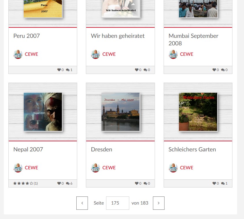 Wir laden Sie herzlich ein, die neue CEWE Community mit integriertem Forum zu entdecken und künftig zu nutzen. Das bisherige Forum, in dem Sie sich gerade befinden, steht nur noch bis Ende 2025 für neue Beiträge zur Verfügung und wird ab dem kommenden Jahr 2026 nur noch lesend zugänglich sein. Informieren und registrieren Sie sich jetzt in der neuen CEWE Community – wir freuen uns auf Sie! Kundenbeispiele in der CommunityGern sehe ich mir die Kundenbeispiele in der Community an. Hin und wieder blättere ich mal nur so wahllos in Büchern rum. Zurzeit stehen für Fotobücher 163 Seiten mit je 18 Büchern zur Verfügung. Muss man, wenn man beispielsweise mal auf die Seite 100 blättern will, die Seiten immer einzeln weiterklicken. Ich habe schon versucht eine Zahl in Seite … von 163 einzugeben. Hat aber auch nicht geklappt. Gibt es einen einfacheren Weg?