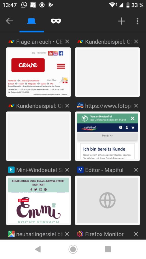 Beim Android-Smartphone oder Tablet bleiben deine geöffneten Seiten aber bestehen, solange du den Tab nicht explizit schließt - das ist bei Firefox so, ich denke bei anderen Browsern auch. Selbst wenn das Smartphone ausgeschaltet und neu gestartet wird, sind die Tabs anschließend noch da. Du kannst sie nach Bedarf aktivieren. Das kann man in den Einstellungen so festlegen. Chronik und Lesezeichen gibt es aber auch. Wie gesagt, Android und Firefox. Andere können sicher zu anderen Browsern und I-Phone was sagen. Viel Spaß mit den "Neuzeit"-Geräten. Ich habe mich viel zu schnell daran gewöhnt PS: Du kannst dir einfach einen Tab für die Community anlegen, dann verpasst du Monika54' Fotobuch sicher nicht liebe Grüße