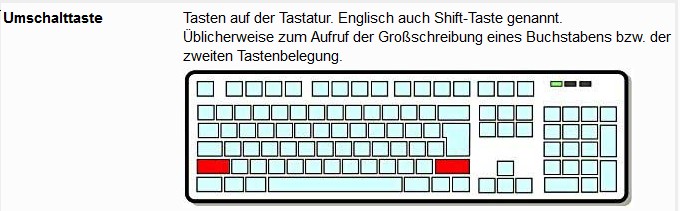 Hier ist meines Erachtens ein inhaltlicher Fehler. Das, was Sie meinen, ist wohl die Feststelltaste (shift-lock). Die Umschalttaste ist die Taste für Großbuchstaben (Shift = Pfeil nach oben) Re: ForenglossarWenn ich diese ganze Liste an Korrekturvorschlägen so lese: Wäre ess nicht sinnvoller gewesen, dieses Glossar zuerst im Gurubereich einzustellen, und erst später eine bereinigte Version im Inside-Bereich ||