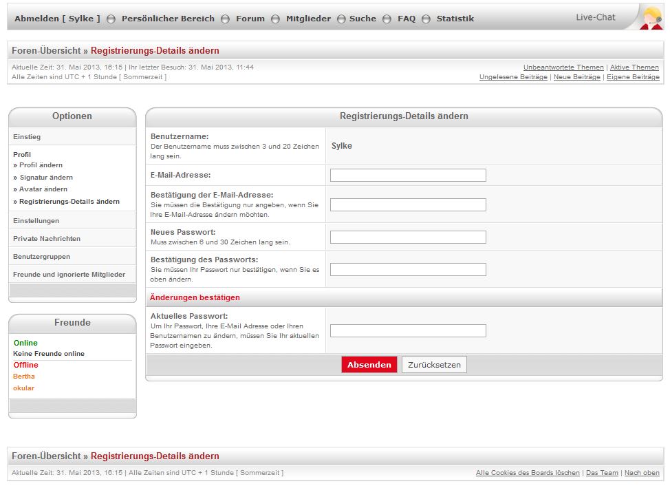 Sie können das Passwort in Ihrem persönlichen Bereich ändern. Nachdem Sie sich erfolgreich angemeldet haben, erscheint im oberen Bereich der Menüpunkt "Persönlicher Bereich". Öffnen Sie bitte diesen Bereich und wählen Sie unter "Profil" die Option "Registrierungs-Details ändern". Geben Sie dort das neue Passwort ein und bestätigen Sie die Eingabe mit "Absenden" Sylke Wer ist online?Mitglieder in diesem Forum: 0 Mitglieder und 5 Gäste