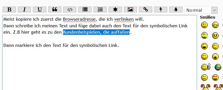 Dann schreibe ich meinen Text und füge dabei auch den Text für den symbolischen Link ein. Z.B hier geht es zu den Kundenbeispielen, die auffallen. Nochmal im Überblick: