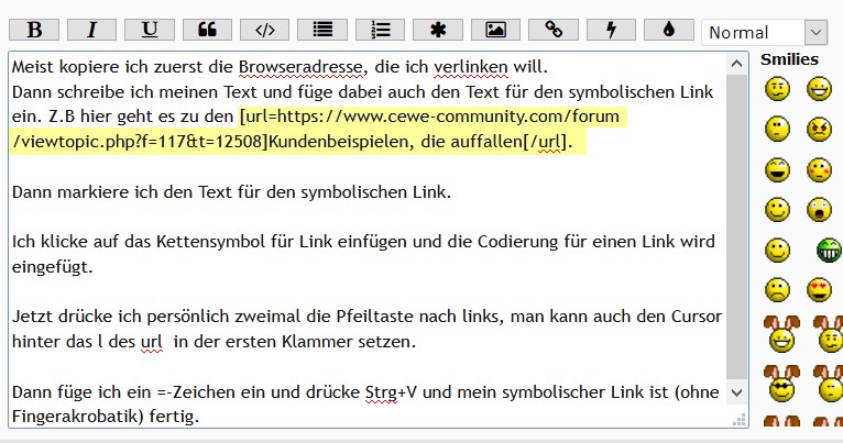 im Beitrag Kundenbeispiele, die auffallen ist es ja wünschenswert, dass nicht einfach die Links aus der Browseradressleiste eingefügt werden, die dann so aussehen: viewtopic.php?f=117&t=12508, sondern dass der Titel des Buches in einen sogenannten symbolischen Link eingebettet wird. Der kann dann so aussehen: Ich finde dieses Fotobuch ganz toll: Unsere standesamtliche Trauung Ich habe aber manchmal den Eindruck, dass diese Links, die ja einfach nur in blauer Farbe (bzw. rot in Ö und CH) erscheinen, gar nicht als Links erkannt werden. Vielleicht hilft mein Beitrag, ihnen ein bisschen mehr Aufmerksamkeit zu verschaffen. Wie man einen solchen Link erstellt, hat Sylke in ihrer Forenanleitung zur Einbettung von Links beschrieben. Da ich oft am Smartphone arbeite, bringt mich das Kopieren und Einfügen der winzigen Klammer rasend schnell ans Ende meiner Geduld. Deshalb mache ich es inzwischen etwas anders. Weil es vielleicht der einen oder dem anderen auch hilft, will ich euch meine Methode mal zeigen. liebe Grüße