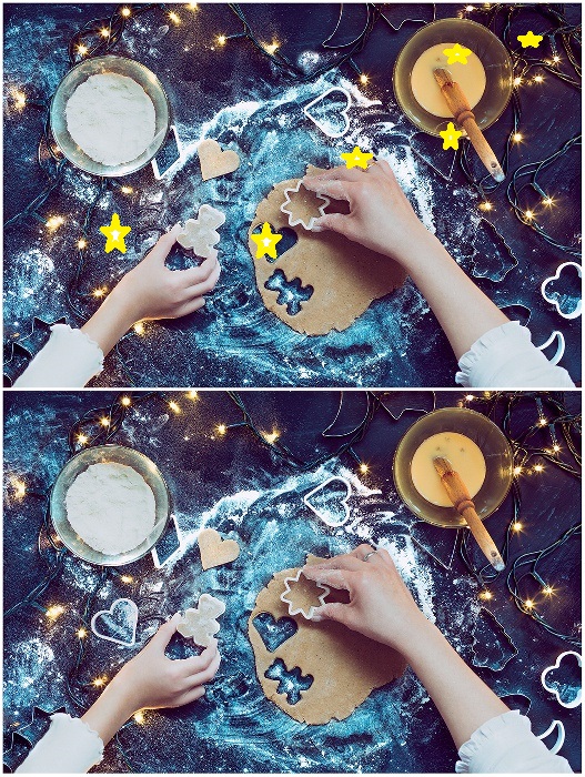1. die Ringfarbe gold/silber 2. der fehlende dunkle Punkt im rechten Schälchen 3. ein fehlender Lichtstern in der oberen rechten Ecke 4. ein fehlendes Mehlhäufchen etwa in der Mitte oben 5. ein fehlendes Ausstecher-Herz links neben der linken Hand 6. ein fehlendes Mehlhäufchen im ausgestochenen Herzchen 7. andere Lage des Herzausstechers beim rechten Schälchen (über dem Schälchenrand) - dazu habe ich am längsten gebraucht. Liebe Grüße