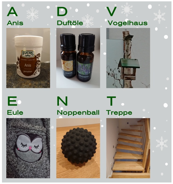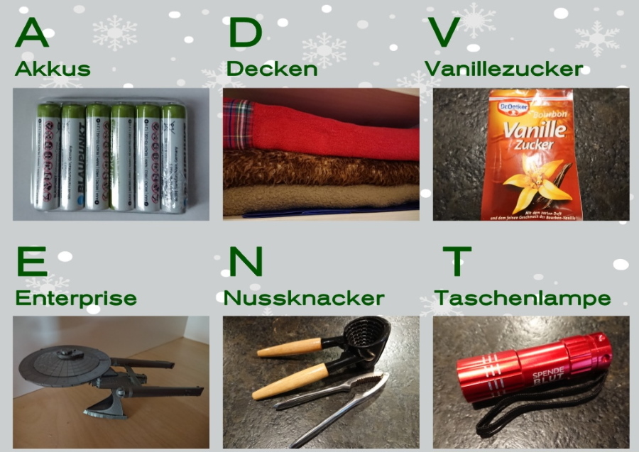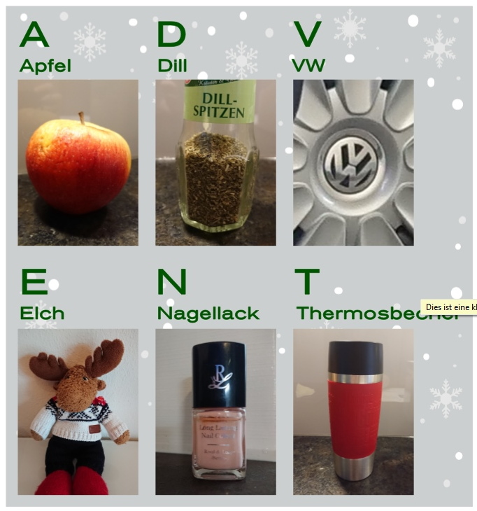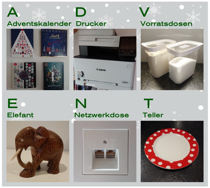 A... Anzug D...Drinks V...Vase E.. Elchgeweih N .. Nase T... Tanzfläche Re: 1. Dezember | Kategorie: FotografieNebenbei eingeworfen, in knapp 4 Stunden gibt es das erste Rätsel. Ich bin bis dahin offline, werde aber pünktlich wieder online sein. Ich freue mich auf weitere Einreichungen zum Thema