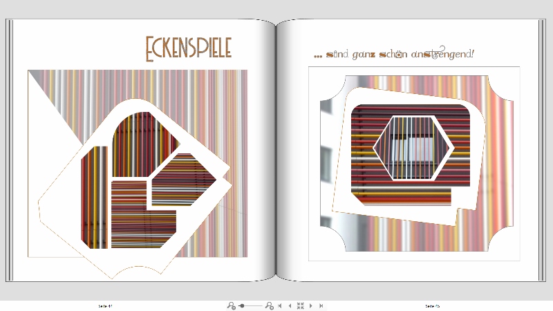 Wir laden Sie herzlich ein, die neue CEWE Community mit integriertem Forum zu entdecken und künftig zu nutzen. Das bisherige Forum, in dem Sie sich gerade befinden, steht nur noch bis Ende 2025 für neue Beiträge zur Verfügung und wird ab dem kommenden Jahr 2026 nur noch lesend zugänglich sein. Informieren und registrieren Sie sich jetzt in der neuen CEWE Community – wir freuen uns auf Sie! Re: 18. Dezember | Kategorie: SoftwareUnd einmal Spielmatzalarm mit ausschließlich einfarbigen Bildern und jeder Menge Ecken, Transparenzen, Verläufen...