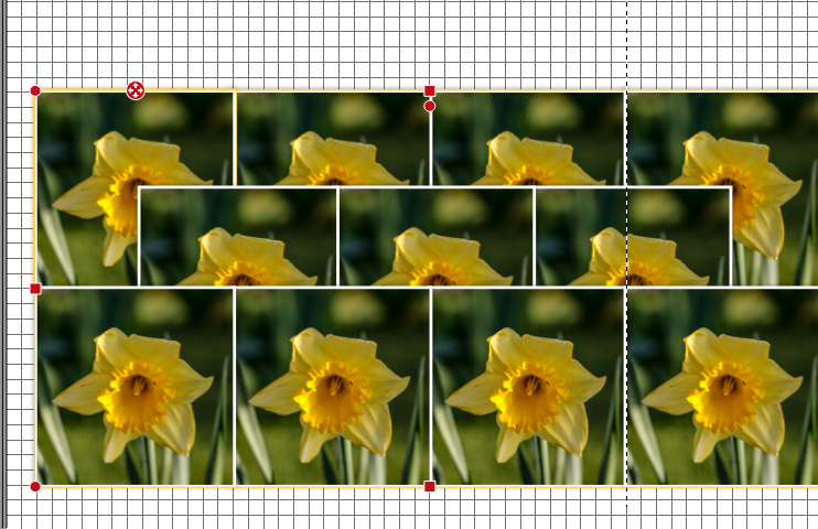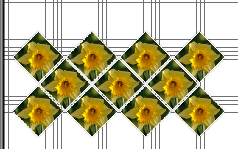 Lege die Fotos in einer Größe von beispielsweise 7 cm direkt nebeneinander, die zweite und dritte Reihe passend ausrichten, dann alles markieren und unter Objekte positionieren - Objektgröße ändern - Absolute Größe einstellen auf z.B. 6,5 x 6,5 geändert und bei Eckenoptionen 100 einstellen.