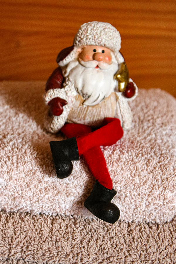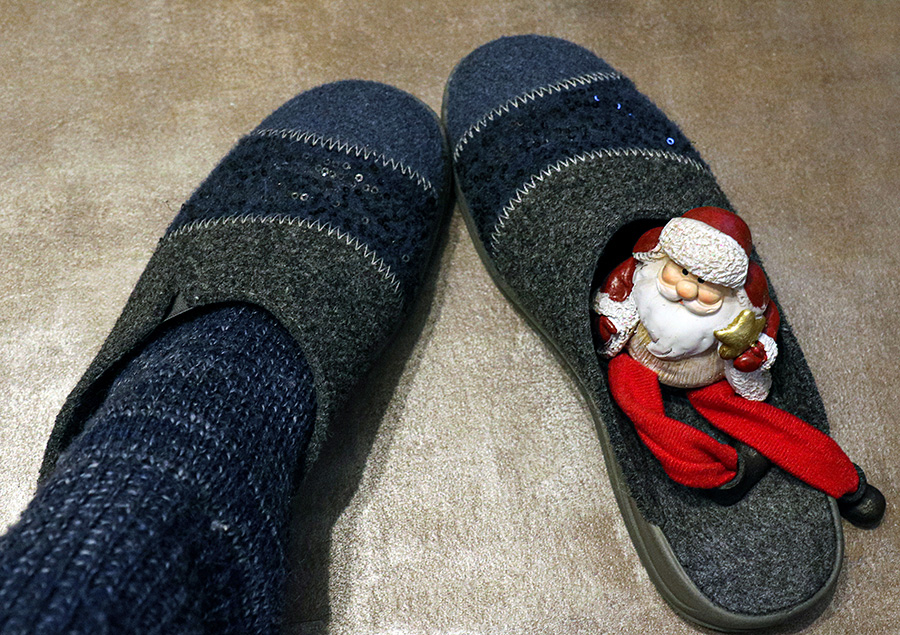 Re: 22. Dezember | Kategorie: FotografieKlausi ist in der Weihnachtszeit überall und treibt seine Späße, hier macht er es sich in meinen langweiligen Hausschuhen gemütlich: