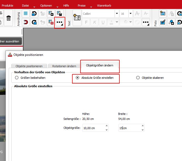 ja das geht. Klicke auf das Foto oder den Platzhalter. Wähle im Menü "Layout" das Icon mit den drei Punkten und dem kleinen Dreieck. Aus dem sich dort öffnenden Menü wählst Du den Schraubenschlüssel mit dem Pluszeichen. Es öffnet sich ein Fenster. Dort wählst Du den rechten oberen Reiter "Objektgröße ändern" und klickst dann auf "absolute Größe einstellen" und machst eben genau das. Viel Erfolg! Lieber Gruß, pitty